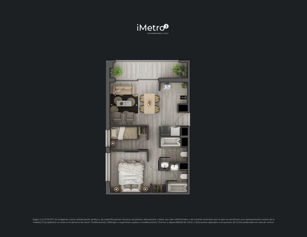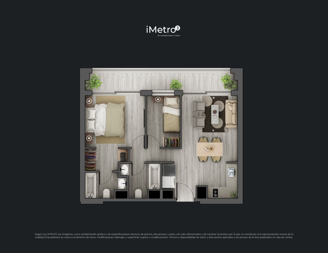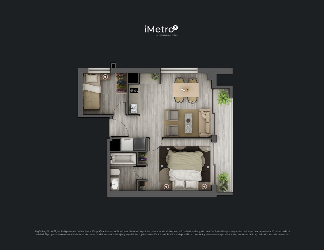 Según Ley Nº19.472, las imágenes, como ambientación gráfica y de especificaciones técnicas de plantas, elevaciones y loteo, son sólo referenciales y de carácter ilustrativo por lo que no constituye una representación exacta de la realidad. El propietario se reserva el derecho de hacer modificaciones. Metrajes y superficies sujetos a modificaciones. Precios a disponibilidad de stock y descuentos aplicados a los precios de la lista publicados en sala de ventas.